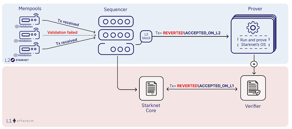 Transactions on Starknet follow a well-defined lifecycle:- Submission: Users submit transactions through their account contracts.