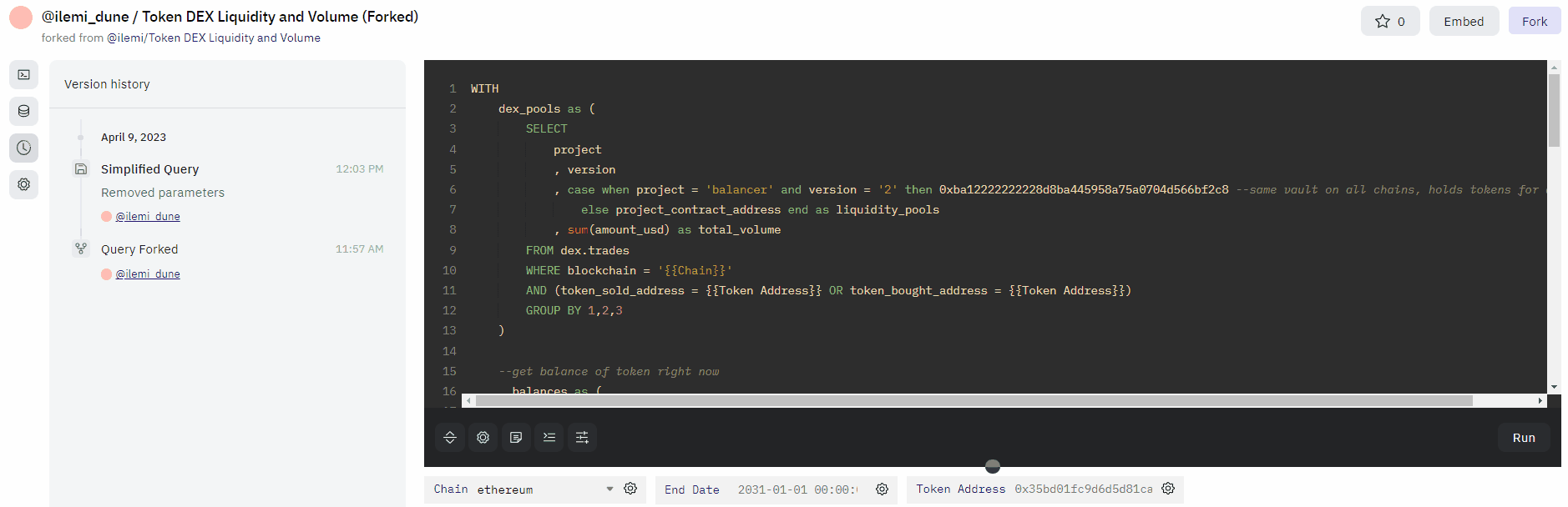 The first time you save a query (whether it is forked or freshly created), there will be an initial commit to the query history. If you’ve forked the query, you won’t be able to access the original query’s edit history - it starts anew for you.Saving and naming versions